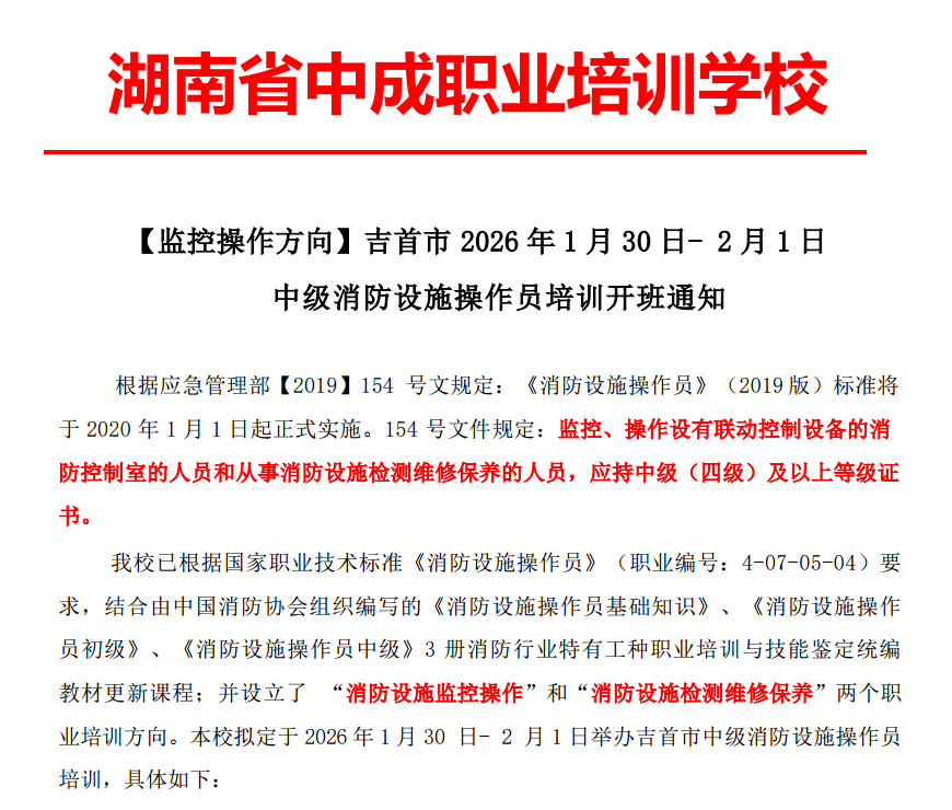 2026年1月湘西(吉首市)消防设施操作员培训班将于1月30~2月1日开班(文后附最新岗位需求,推荐上岗)